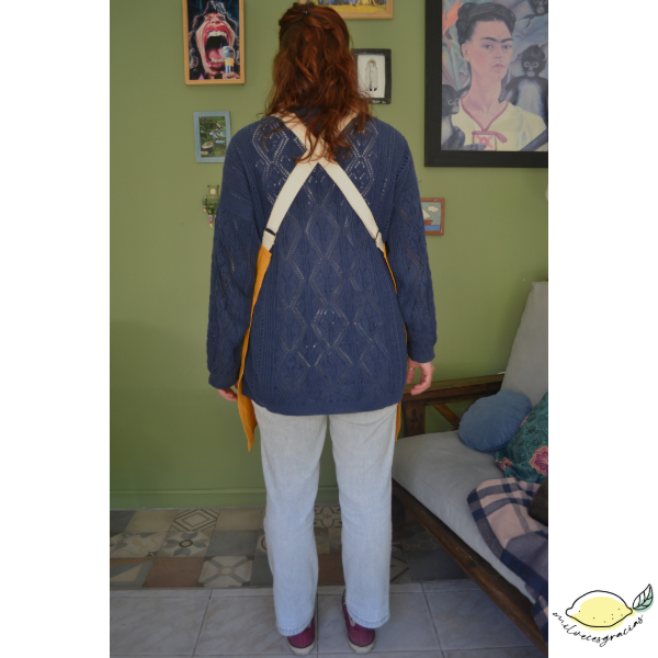 Delantal con correa de 3cm de ancho, con posibilidad de regular su tamaño a través de la hebilla.